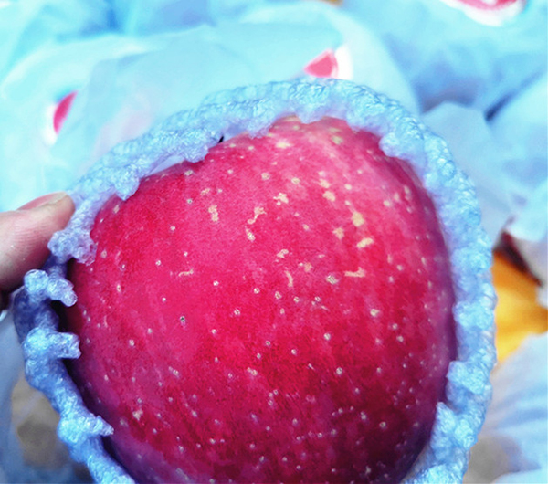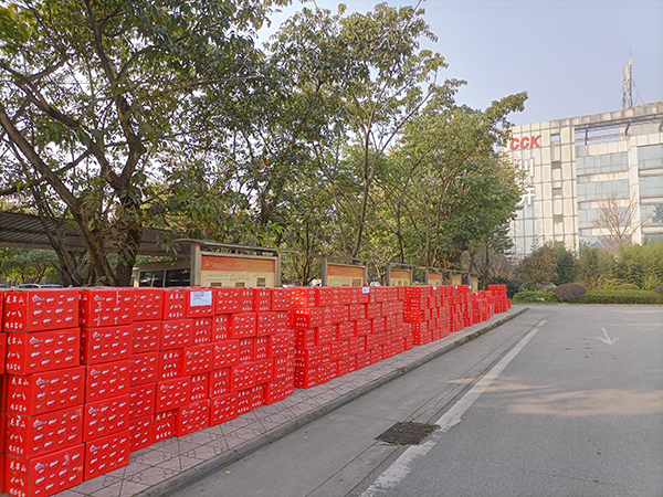 一箱箱红艳艳整齐码放的水果与集团大楼上的CCK商标遥相辉映。
